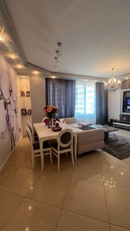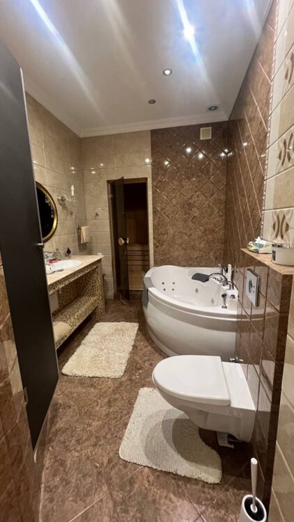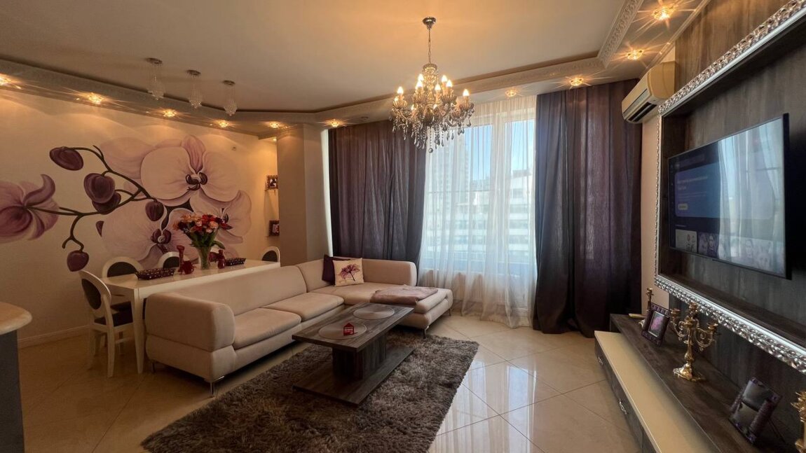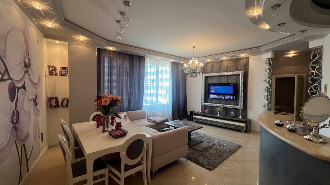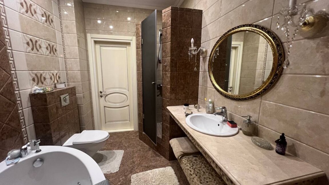 Планировка: гостиная с кухней, спальня, детская комната, 2 санузла (душ, ванная), своя сауна (! ), балкон с видом моря