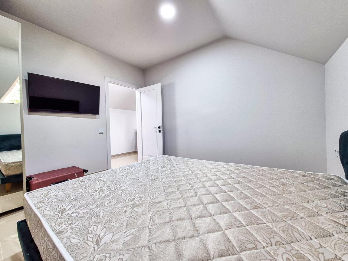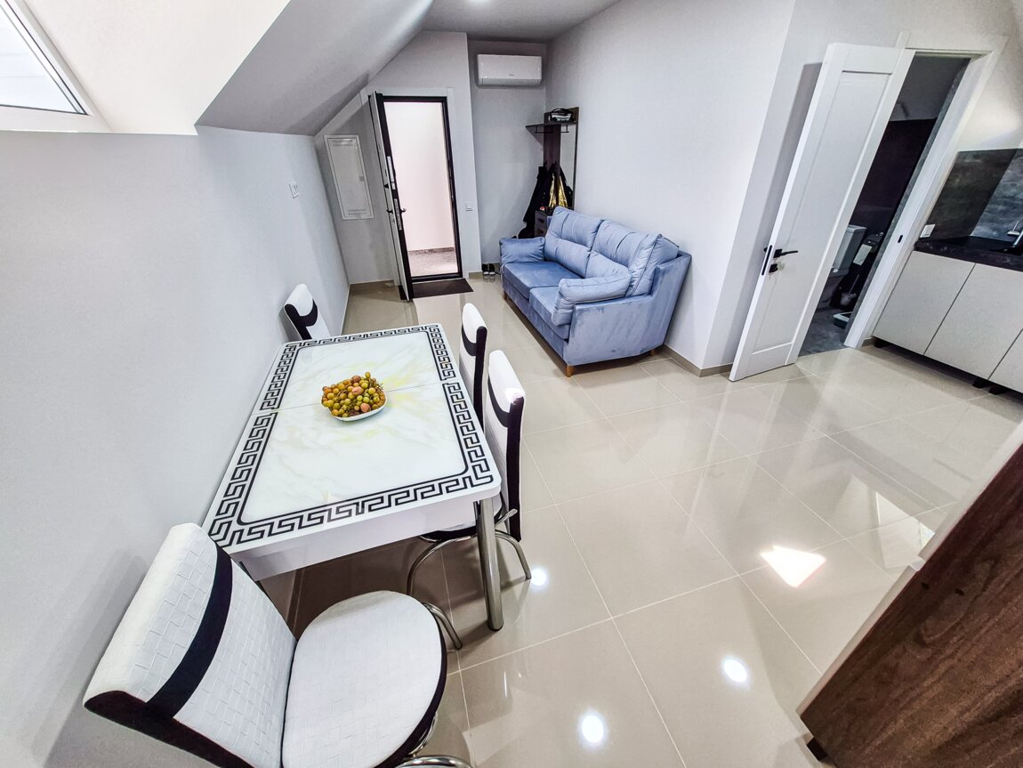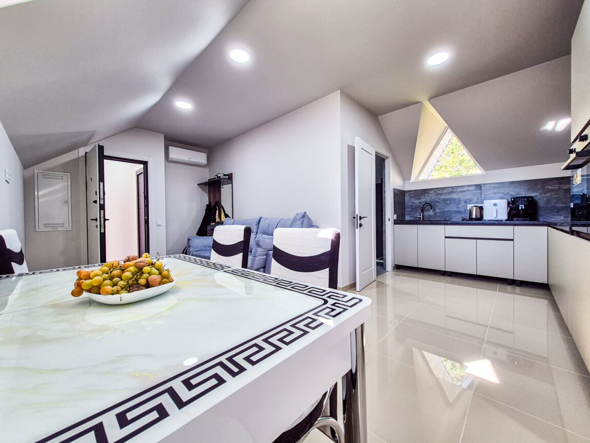 Для досуга и работы доступны смарт-ТВ, бесплатный Wi-Fi и цифровое телевидение. Обеденный стол позволяет удобно готовить и принимать пищу дома, а открытая планировка создаёт ощущение простора.