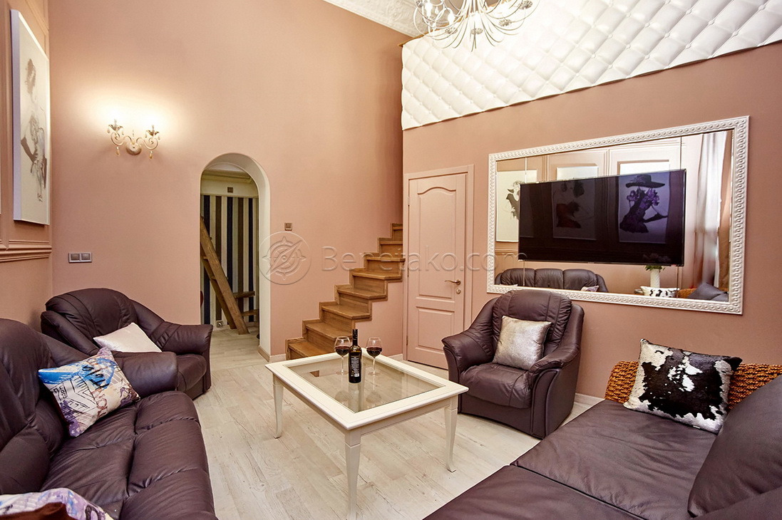Код: 172. ПОМЕСЯЧНО АРЕНДА АКТУАЛЬНА В ПЕРИОД С 01.09 ДО 30.05 (в летний сезон сдается посуточно от 2-х суток, раннее бронирование от 5-и суток и более). Пятикомнатная квартира в центре Одессы, ул. Дерибасовская/угол Греческой площади, 2/3 - эт. дома - памятника архитектуры, общая площадь 100 кв. м. Авторский ремонт, сочетание классики и современного стиля, качественные материалы, высокие потолки (5 м. ), большой зал в двух уровнях с LCD телевизором, четыре спальни с большими двуспальными кроватями, дорогая итальянская мебель, кожаная мягкая мебель, огромная круглая кровать в центре главной спальни, создают атмосферу абсолютного комфорта. Санузел с джакузи на 2 места. Квартира оборудована: 3 кондиционера, плазменный TV + 2 LCD TV в спальнях, WI-FI интернет, большая джакузи, DVD, стиральная машина, CD-магнитола, спутниковое ТВ, микроволновая печь, фен, кофеварка, тостер, телефон. Прекрасный вид из окон на Греческую площадь. Удачное расположение дома, самое сердце Одессы, множество достопримечательностей, потрясающая архитектура, множество кафе и ресторанов под открытым небом. Напротив дома (в самом центре Греческой площади) расположен большой торговый центр «Афина» (с платным подземным паркингом). Вход в дом - железные ворота с домофоном. Допускается проживание с животными. Аренда от 1-го месяца и более. Стоимость может варьироваться в зависимости от срока аренды. Перед просмотром уточните наличие и детали по VIBER, WHATSAPP или TELEGRAM, указав «КОД» из объявления. КОМИССИЯ З