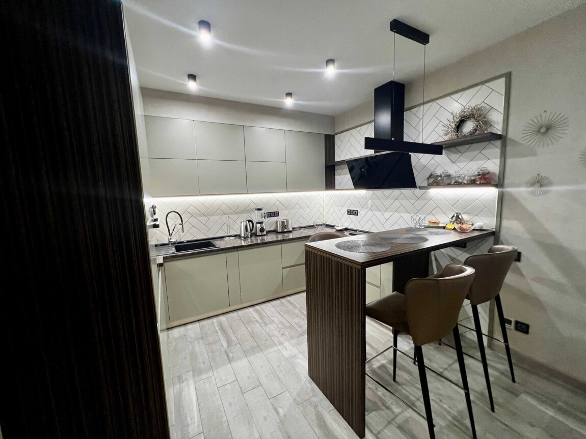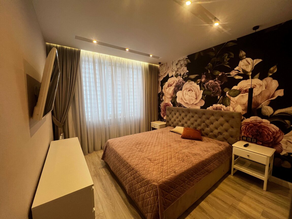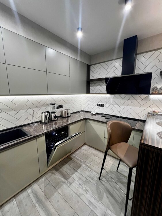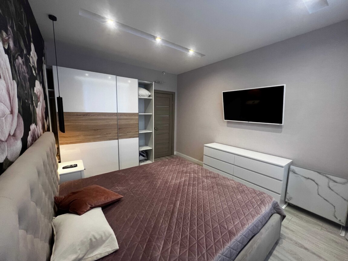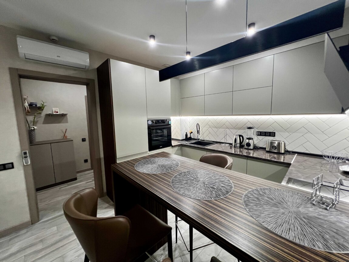 В квартире выполнен дорогой ремонт из качественных материалов. Установлена вся необходимая техника: 2 смарт- телевизора 55", кондиционер, посудомойка, сушильная машина для белья, електрочайник, тостер, блендер. и т. д.