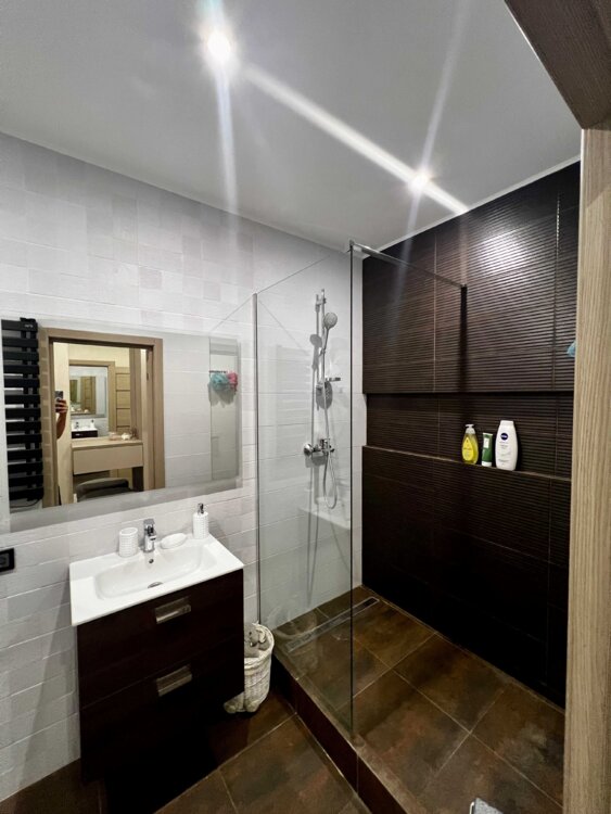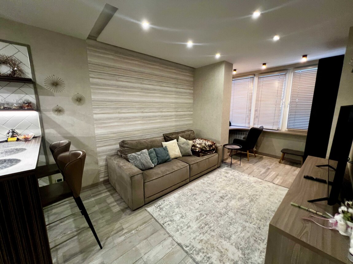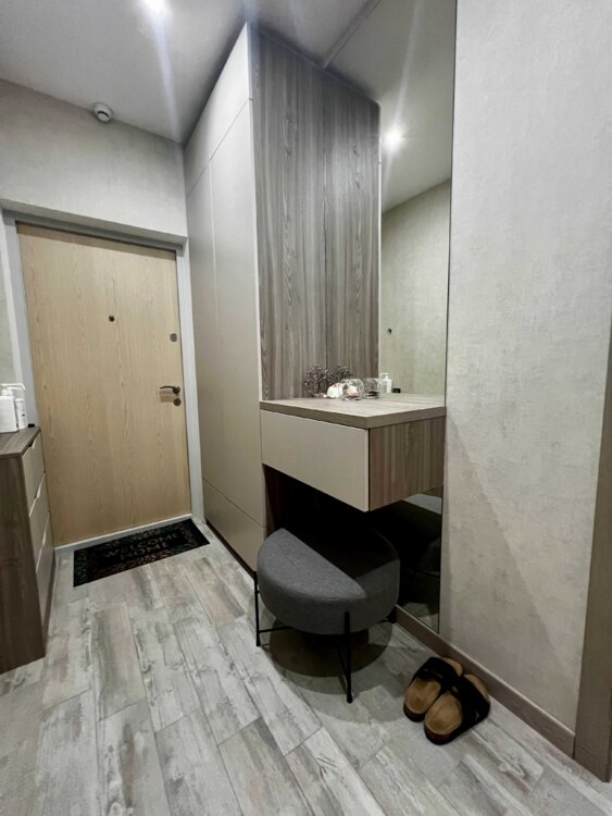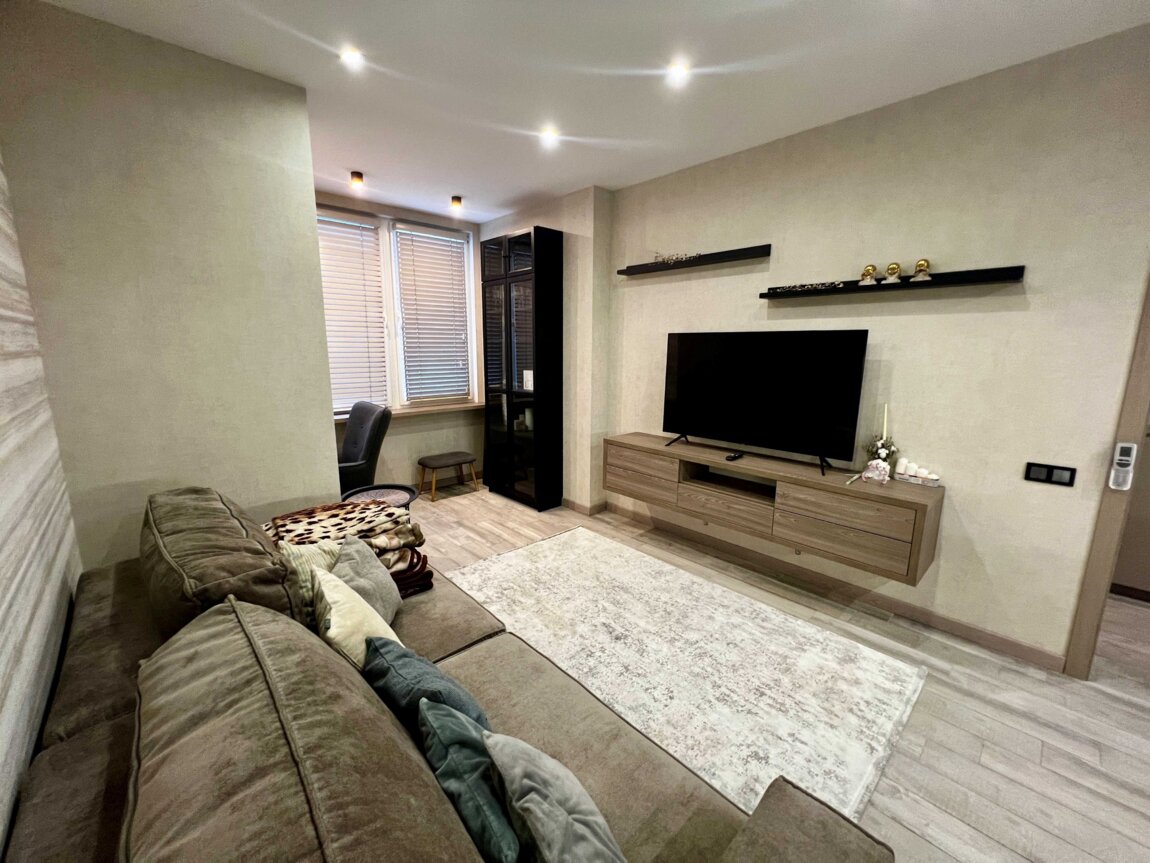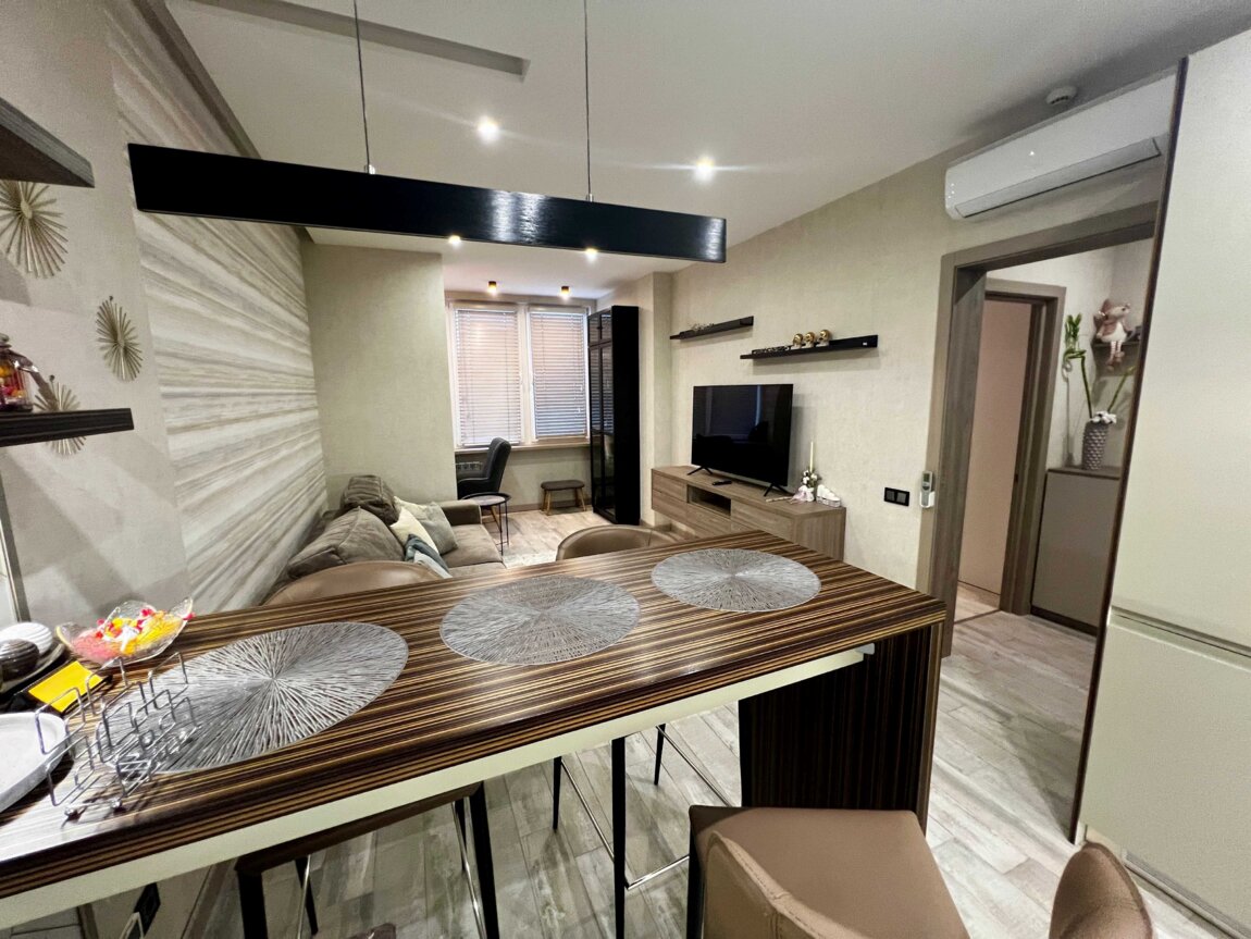 В квартире выполнен дорогой ремонт из качественных материалов. Установлена вся необходимая техника: 2 смарт- телевизора 55", кондиционер, посудомойка, сушильная машина для белья, електрочайник, тостер, блендер. и т. д.