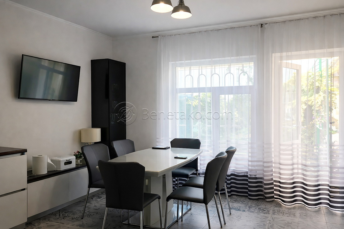 Код: 2249. (В летние месяцы цена немного повышается). Двухкомнатный дом в закрытом кооперативе на ул. Костанди. Евроремонт, общая площадь 100 кв. м., участок 4 сотки. Планировка: гостиная, спальня, большая кухня. В доме есть вся необходимая мебель и бытовая техника: холодильник, посудомоечная машина, варочная панель, утюг, электрочайник, плита, стиральная машина, пылесос, духовой шкаф, микроволновая печь, скоростной Wi-Fi интернет, телевизор, индивидуальное газовое отопление. Автономность при блэкауте: работает интернет, подключено резервное питание, работает отопление, работает водопоснабжение. Очень тихое место и приятные соседи, к морю пешком 10 минут. Своя территория с мангалом, беседкой, и два гостевых дома. В основном доме везде установлены теплые полы. Возможно проживание с животными. Аренда от 6-ти месяцев и более. Стоимость может варьироваться в зависимости от срока аренды. Перед просмотром уточните наличие и важные для вас детали по VIBER, WHATSAPP или TELEGRAM, указав «КОД» из объявления. КОМИССИЯ ЗА УСЛУГИ РИЭЛТОРА - 50% от месячной аренды (разовая оплата при оформлении договора).