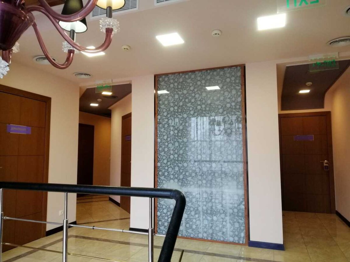 9 кабінетів, 3 санвузли, кухня, гардеробна, душова. Меблі. Система центрального кондиціювання та та автономного опалення. Сигналізація,2 пожежних виходи.