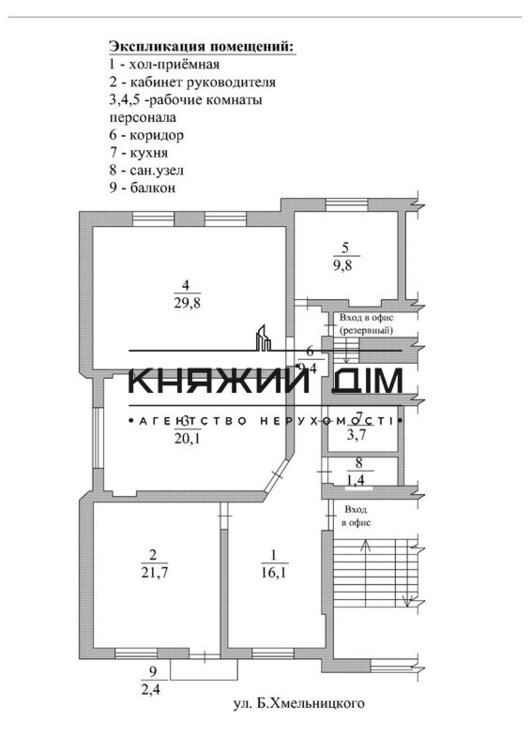 Оренда офісу 112 кв.м на вул. Б.Хмельницького 59, 3/5 цегляного будинку. Загальна площа – 112 кв.м. Повний новий євроремонт. 4 кабінети, приймальня та обладнана міні-кухня. Відремонтована парадна. Парковка для автомобілів, шлагбаум. 5 міських телефонних ліній (Укртелеком). Вдале планування. Кондиц., міні АТС, комп'ютерна, телефонна розводка, сигналізація (охоронна, пожежна), відеоспостереження, електрозамок, бронедвері, грати, бойлер, вбудовані шафи, антресолі тощо. Нежитловий фонд. Ціна 38900 грн/міс. Код об'єкта: 1418905
