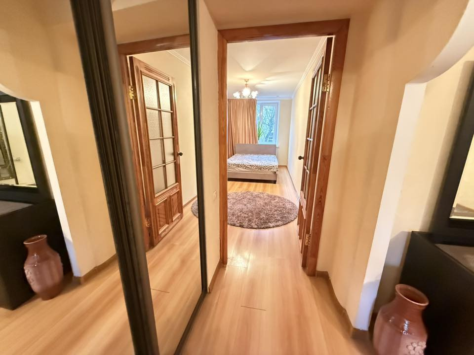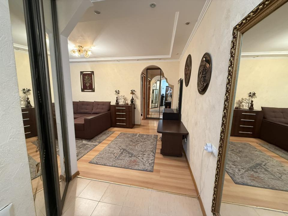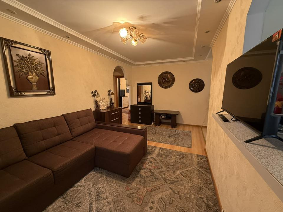 Locuința cu suprafața totala 77m2 pe acte 56,8 mp și este compartimentată în: 2 camere, living, bucătărie, balcon, bloc sanitar, garderoba și antreu.
