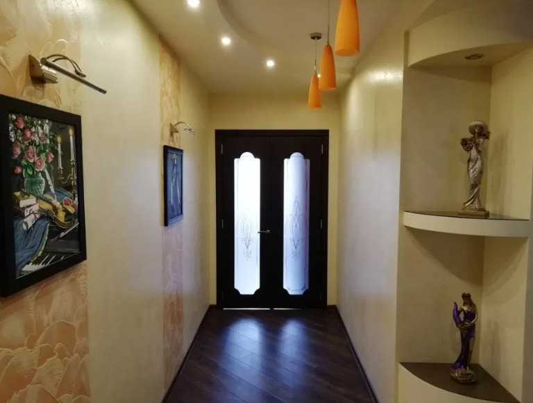 Одна спальня и кухня перепланирована в кухню- студию, просторную, со складывающимся двуспальным диваном.