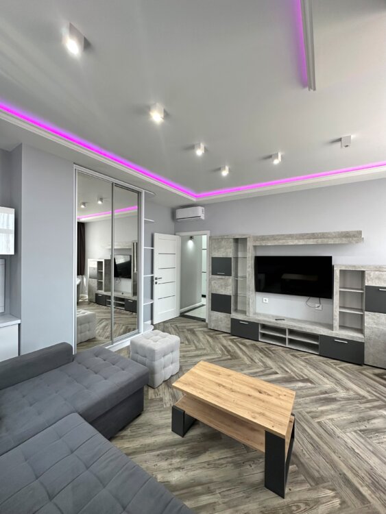 Планировка - две отдельные спальни, просторная гостинная с двумя полноценными рабочими местами и огромным диваном, раздельный санузел и гардеробная.