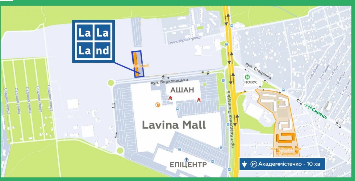 (Lavina Mall, Novus, Ашан, Епіцентр), на території: дитячий садок, школа, ліцей, парк, велодоріжки, поруч лісова зона.
