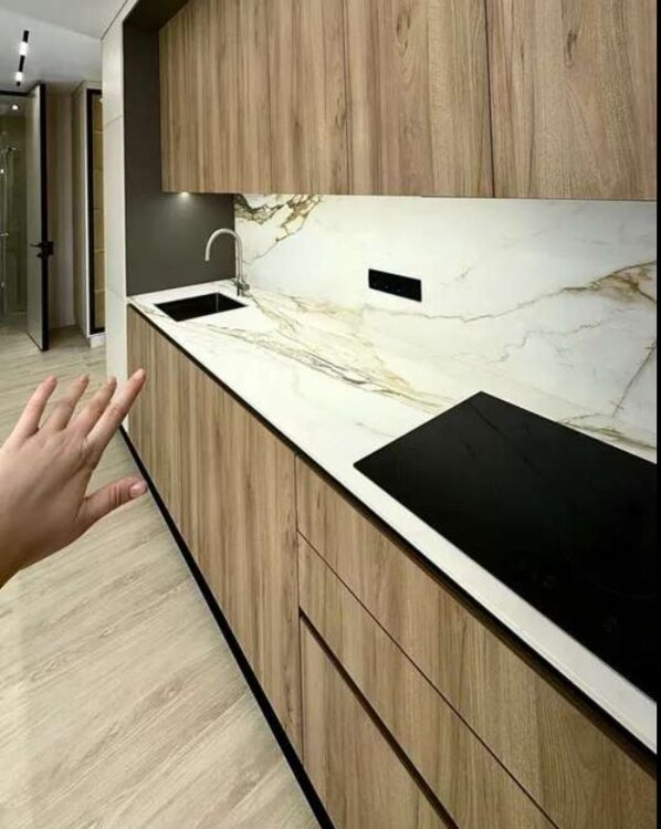 Кухня из дорогих материалов, керамический камень - столешница, с того же материала рабочая стена, все цельное, не из плитки.