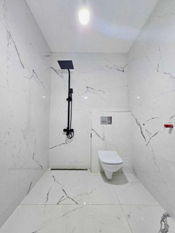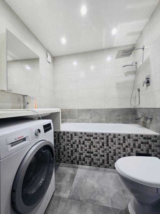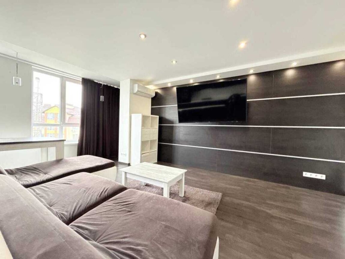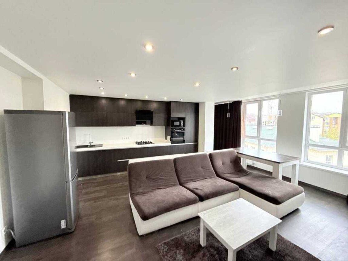 Перший поверх: кухня-студія та ванна кімната; встановлені меблі та побутова техніка, тепла підлога.