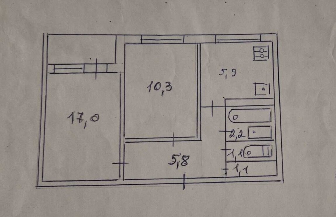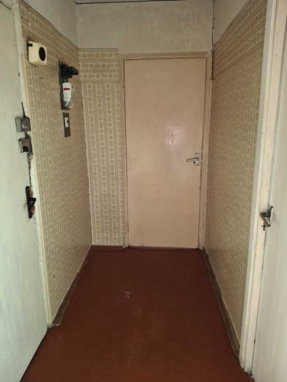 В квартирі є шафа, посуд, телевізор, газова плита, лічильники, домофон. Загальний стан квартири - потрібен ремонт (вікна деревяні, підлога лінолеум). Ванна та туалет після ремонту.