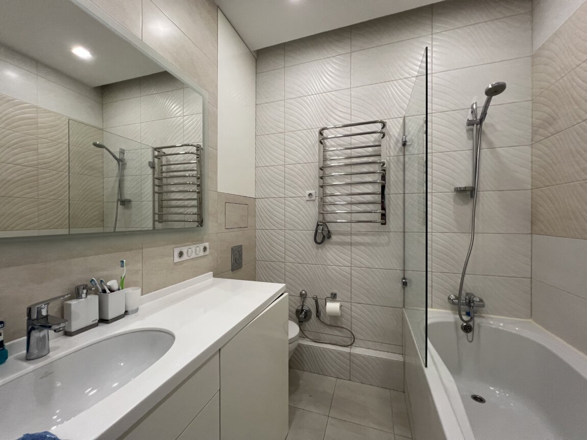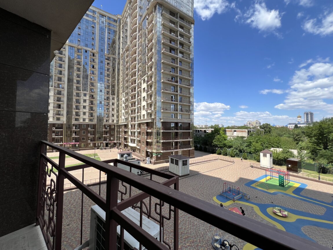 Квартира на 4-м этаже, охраняемая территория, есть лифт, подземная парковка, ухоженный двор с фонтаном.