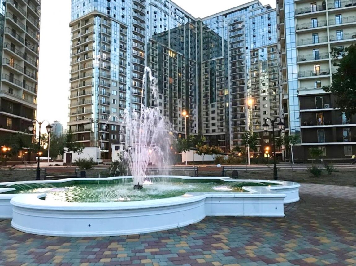 Красивый двор с ландшафтным дизайном, фонтаном, детскими площадками.