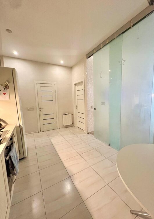 Кухня-вітальня відокремлена скляною перегородкою і може розглядатися як додаткова кімната (спальня).