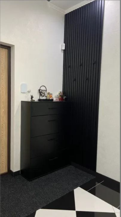 В прихожей выполнена отделка декоративными стеновыми панелями. Также предусмотрена большая и удобная гардеробная/кладовая. Не забыли установить батарею, и во время отключения свет всегда есть.