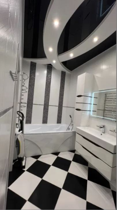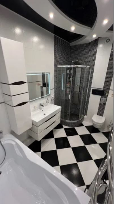 В квартире оборудована полноценная ванная, включающая в себя большую просторную ванну, душевую кабину с декоративной мозаикой. Установлена?? душевая система Ravak, смесители Grohe, унитаз Villeroy&Boch.