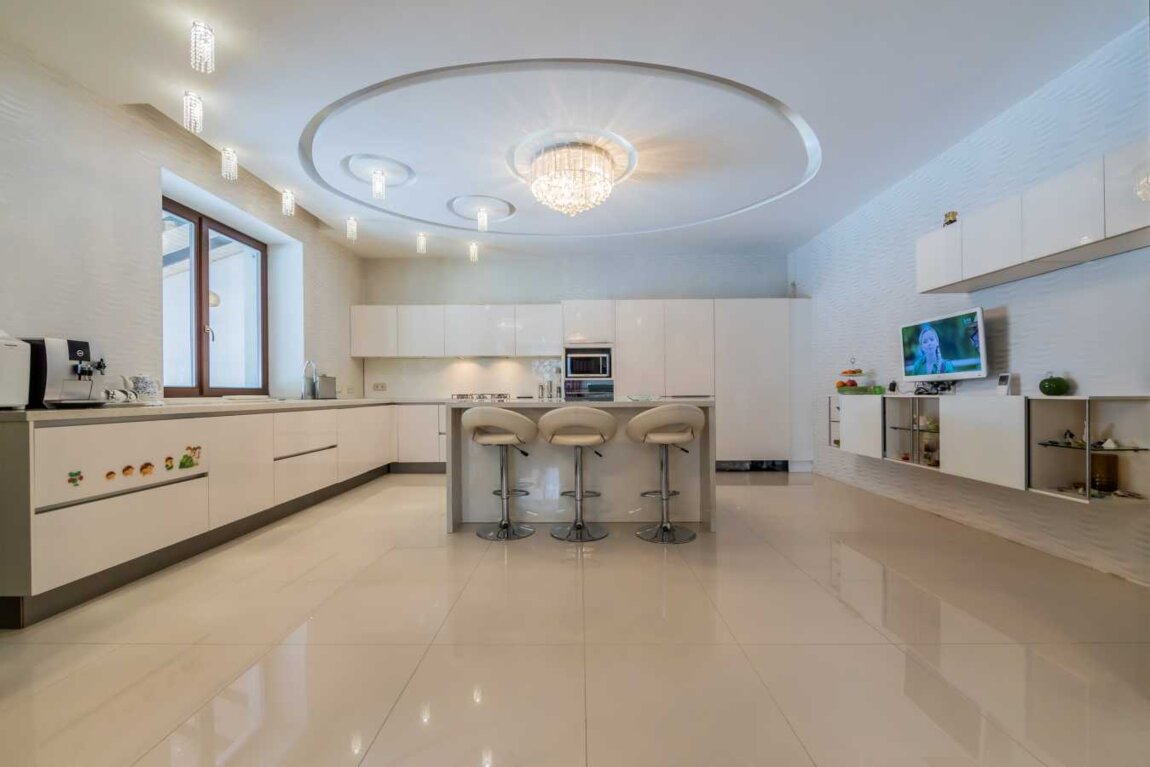 Кухня изготовлена по индивидуальному заказу фасады и столешница из стекла Обеденный стол и стулья итальянского производителя. В доме установлены 4 телевизора, свой домашний кинотеатр, своя сауна, тринажорный зал