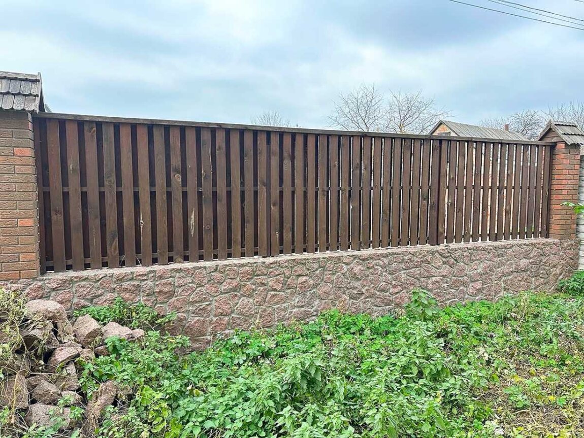 Паркан : гранітний камінь та дерево, стовпчики - декоративна цегла.
