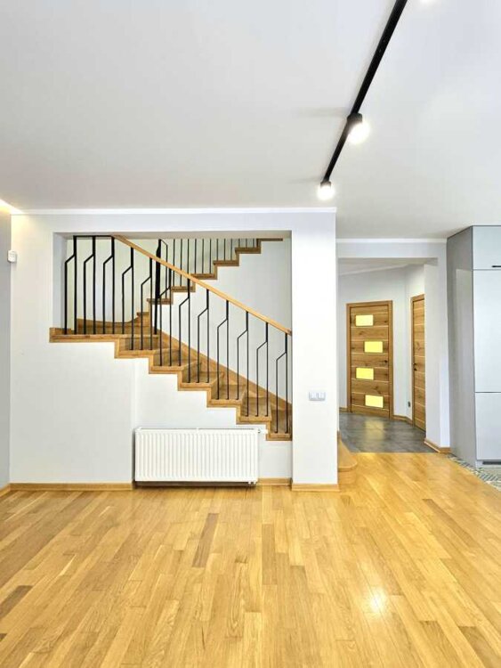 На першому поверсі велика кухня-вітальня з виходом на терасу. Окремо є кімната для будь-яких потреб, це може бути кабінет, кімната для навчання дітей, для гостей або спальна для старших батьків.