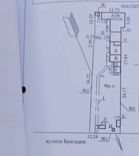 Участок и дом старой постройки на Бригадной/ 7 ст Б. Фонтана. Фасад 12 м. Участок правильной формы, дом в правом дальнем углу. Длина участка 45,5 м. Кадастровый номер. Под строительство жилого дома.