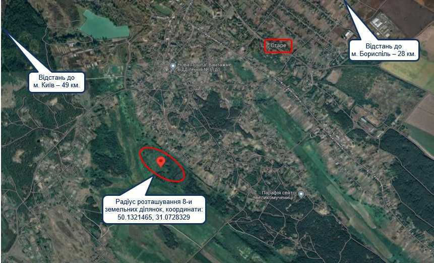 Ділянки характеризуються наявністю багаторічних зелених насаджень дерев та кущів, наявне незначне заболочення. Підїзд до ділянок по рунтовій дорозі. Інженерні комунікації знаходяться на відстані 1 км. Відстань до м. Бориспіль 28 км., до м. Києва 49 км.