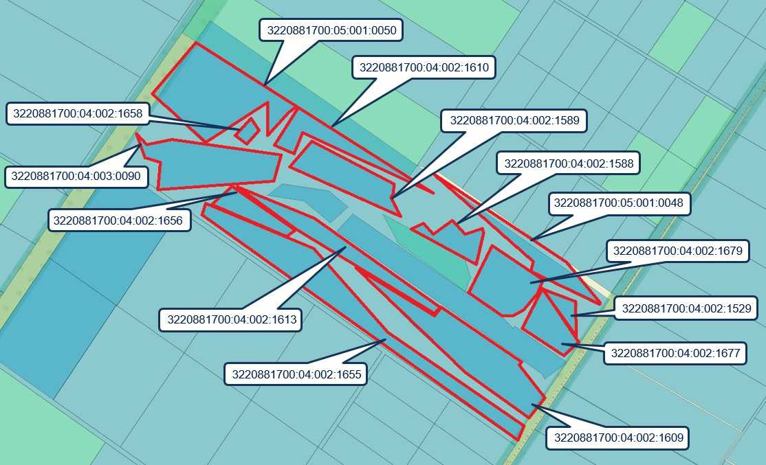 Поруч продається ще 13 ділянок з аналогічним цільовим призначенням площею від 0,0724 до 1,2841 га.
