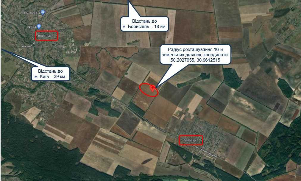 Контакти для зв’язку: 0504327942 Євгенія. Пропонується до продажу земельна ділянка площею 1,4890 га, яка знаходиться за адресою: Київська обл., Бориспільський р-н, Вороньківська с/р.