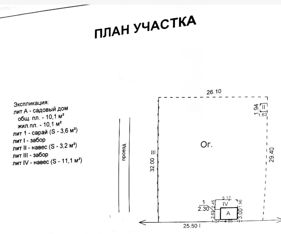 Участок ровной, правильной формы, огорожен по периметру, есть небольшое дачное строение.