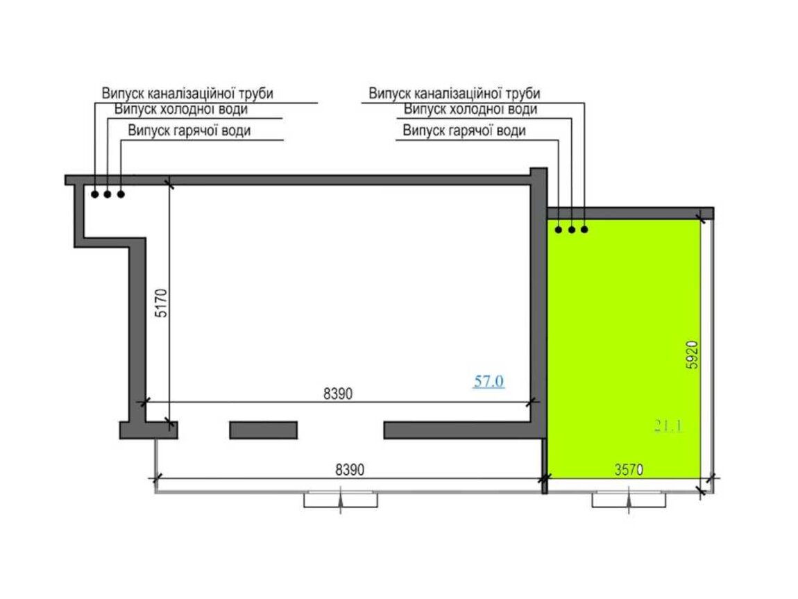 Загальна площа 21.1 м2. Об’єкт має зручне планування та всі необхідні комунікації: передбачені випуски каналізаційної труби, холодної та гарячої води, що дозволяє облаштувати простір під будь-який вид діяльності.