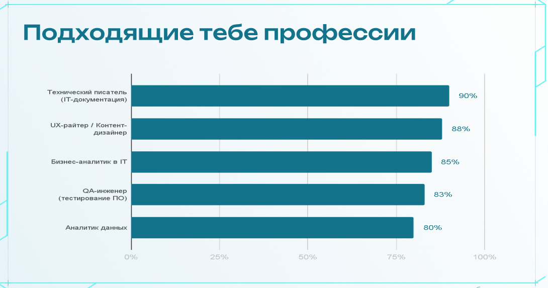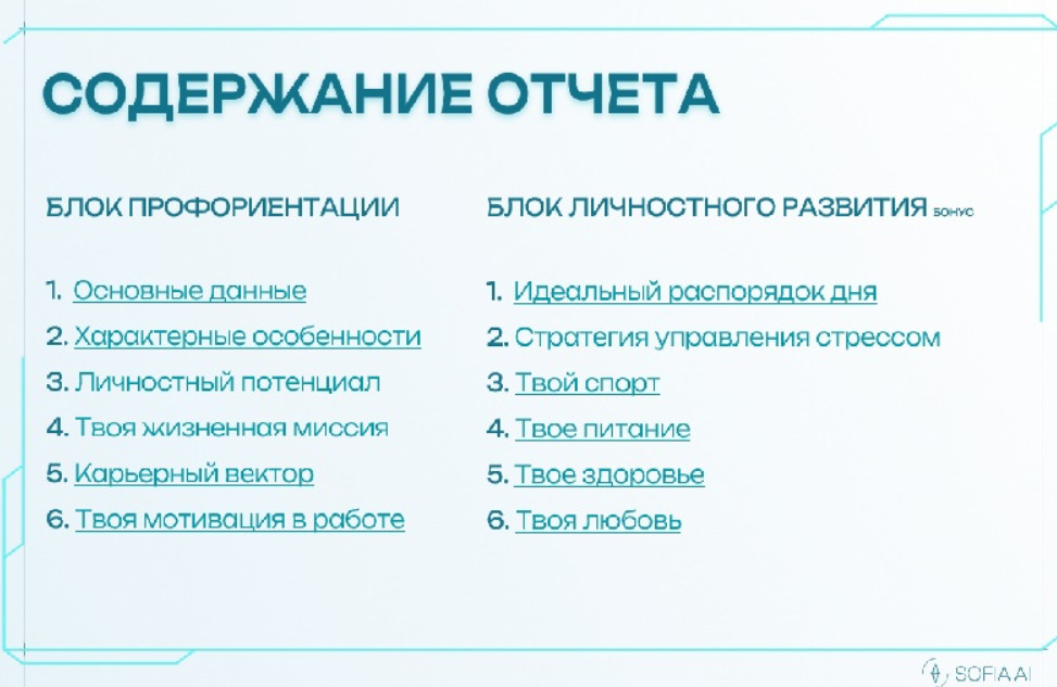 SofiaAI анализирует ваши способности, ценности, мышление, мотивацию и сопоставляет их с реальными трендами рынка труда.