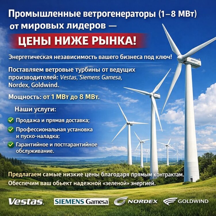 Энергетическая независимость вашего бизнеса под ключ! Поставляем ветровые турбины от ведущих производителей (Vestas, Siemens Gamesa, Nordex, Goldwind).