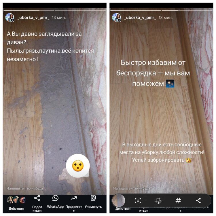 Здесь вы можете найти отзывы и фото моих работ до и после https://www.instagram.com/_uborka_v_pmr_?igsh=MTg3Nnl4ZWRrM3F2cQ==