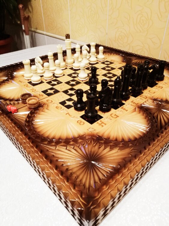 У нас цены от 5тыс лей выбираете. Нарды шахматы ореховые борта ручная резьба вырезанные техникой Геометрия со всех сторон и боков также и внутри нард на бортах есть резьба клетки поля вырезаны в форме звёзд нарды облагорожены чеканкой по дереву размер нард 60 на 60см фигурки и фишки ясень дуб кубики кость. Поиграл и повесил на стенку украсит любой интерьер и создаст уютную обстановку а не будут пылиться в углу. Широкий выбор в наличии выбираете. Пишите звоните телеграм ватцап ваибер и мы вам поможем выбрать эксклюзивные нарды ручной резьбы!