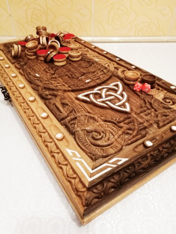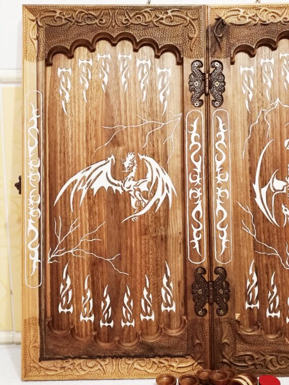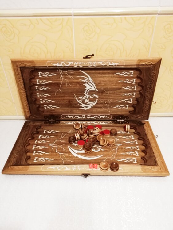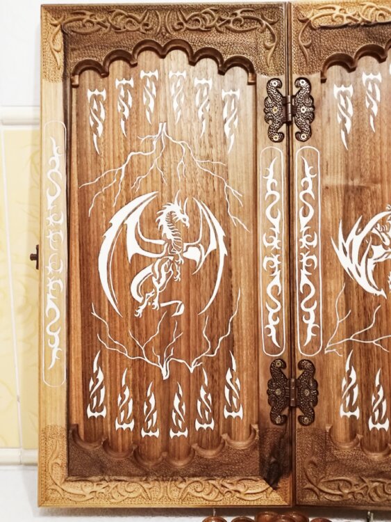 Нарды ореховые не боятся воды и солнца технология изготовления позволяет использовать всепогодно нарды ручная резьба вырезанные из Чёрного ореха со всех сторон и боков также и внутри нард на бортах есть резьба всё белое аппликация из кости нарды пропитаны воском и канифолем по стариной технологии Вечные нарды облагорожены чеканкой по дереву размер нард 57 на 57см фишки Двухцветный орех кубики кость. Поиграл и повесил на стенку украсит любой интерьер и создаст уютную обстановку а не будут пылиться в углу Широкий выбор в наличии выбираете. Пишите звоните телеграм ватцап ваибер и мы вам поможем выбрать эксклюзивные нарды ручной резьбы а не дешёвую поделку вырезанные на станке выдающую за ручную резьбу!