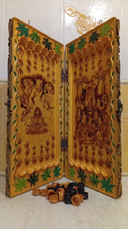 Нарды ручная резьба вырезанные со всех сторон и боков также и внутри нард на бортах есть резьба цветные био лаки нарды облагорожены чеканкой по дереву размер нард 60 на 60см фишки ясень дуб кубики кость. Поиграл и повесил на стенку украсит любой интерьер и создаст уютную обстановку а не будут пылиться в углу. Широкий выбор в наличии выбираете. Пишите звоните телеграм ватцап ваибер и мы вам поможем выбрать эксклюзивные нарды ручной резьбы а не дешёвую поделку вырезанные на станке выдающую за ручную резьбу!