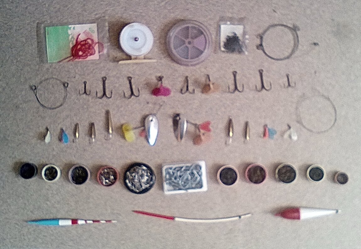 Крючки (№ 6; 7; 8,5; 10; 12; 14), блесны, мормышки, двойники, тройники, металлические поводки, катушка, поплавки, искусственные черви, мухи.