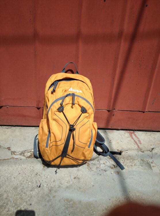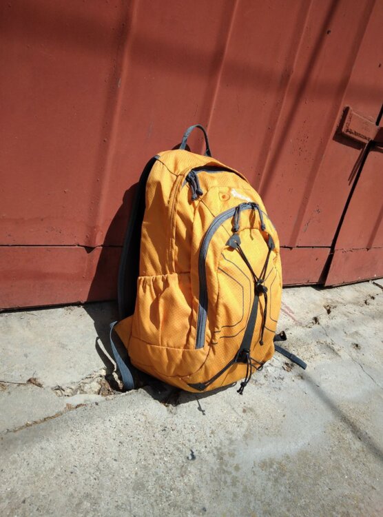 Жесткая эргономичная дышащая спинка, надежная фурнитура. Один основной объем, плюс малый карман-органайзер. Объем примерно 15-20 литров. Состояние хорошее, б/у.