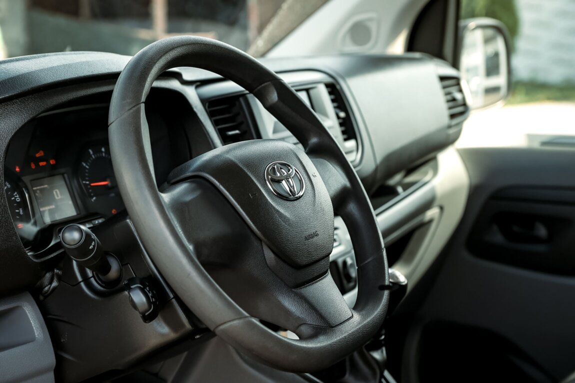 Autoturism confortabil și bine echipat, pregătit pentru oraș și drumuri lungi. La interior găsești aer condiționat, geamuri electrice și închidere centralizată, plus servodirecție și volan reglabil atât pe înălțime, cât și pe lungime pentru o poziție de condus perfectă. Volanul multifuncțional, sistemul audio și calculatorul de bord fac fiecare deplasare mai plăcută și mai practică.La capitolul siguranță, Toyota ProAce D4D an. 2018 dispune de sistem de frânare antiblocare (ABS) și controlul tracțiunii (TCS/ASR/TRC), airbag șofer, pasager și laterale, dispozitiv antifurt și proiectoare de ceață pentru vizibilitate sporită. Anvelopele all-season asigură aderență bună pe tot parcursul anului.