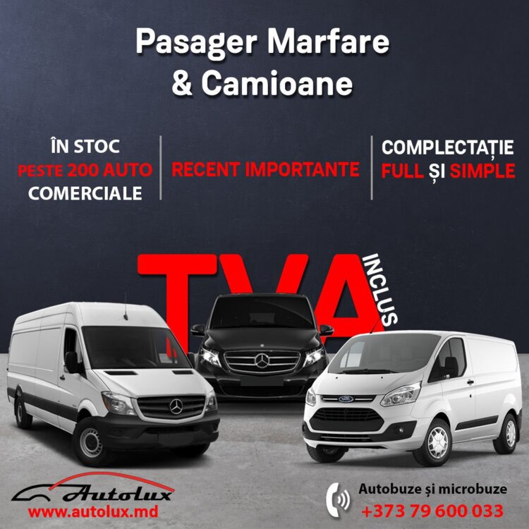 Autoturism confortabil și bine echipat, pregătit pentru oraș și drumuri lungi. La interior găsești aer condiționat, geamuri electrice și închidere centralizată, plus servodirecție și volan reglabil atât pe înălțime, cât și pe lungime pentru o poziție de condus perfectă. Volanul multifuncțional, sistemul audio și calculatorul de bord fac fiecare deplasare mai plăcută și mai practică.La capitolul siguranță, Mercedes Sprinter 319 cu Tva dispune de sistem de frânare antiblocare (ABS) și controlul tracțiunii (TCS/ASR/TRC), airbag șofer, pasager și laterale, dispozitiv antifurt și proiectoare de ceață pentru vizibilitate sporită. Anvelopele all-season asigură aderență bună pe tot parcursul anului.