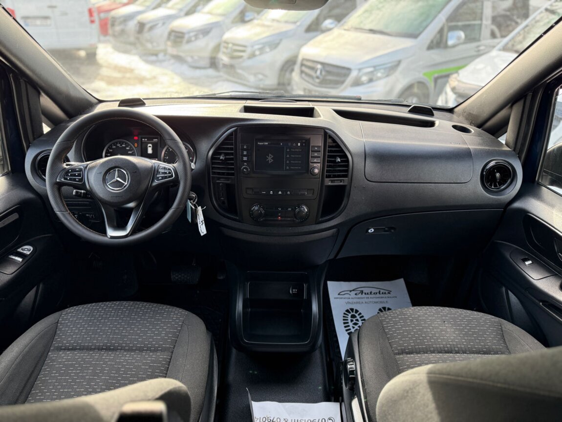 Autoturism confortabil și bine echipat, pregătit pentru oraș și drumuri lungi. La interior găsești aer condiționat, geamuri electrice și închidere centralizată, plus servodirecție și volan reglabil atât pe înălțime, cât și pe lungime pentru o poziție de condus perfectă. Volanul multifuncțional, sistemul audio și calculatorul de bord fac fiecare deplasare mai plăcută și mai practică.La capitolul siguranță, Mercedes Vito Automat cu TV dispune de sistem de frânare antiblocare (ABS) și controlul tracțiunii (TCS/ASR/TRC), airbag șofer, pasager și laterale, dispozitiv antifurt și proiectoare de ceață pentru vizibilitate sporită. Anvelopele all-season asigură aderență bună pe tot parcursul anului.