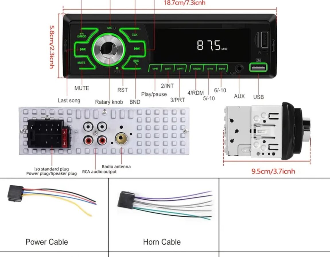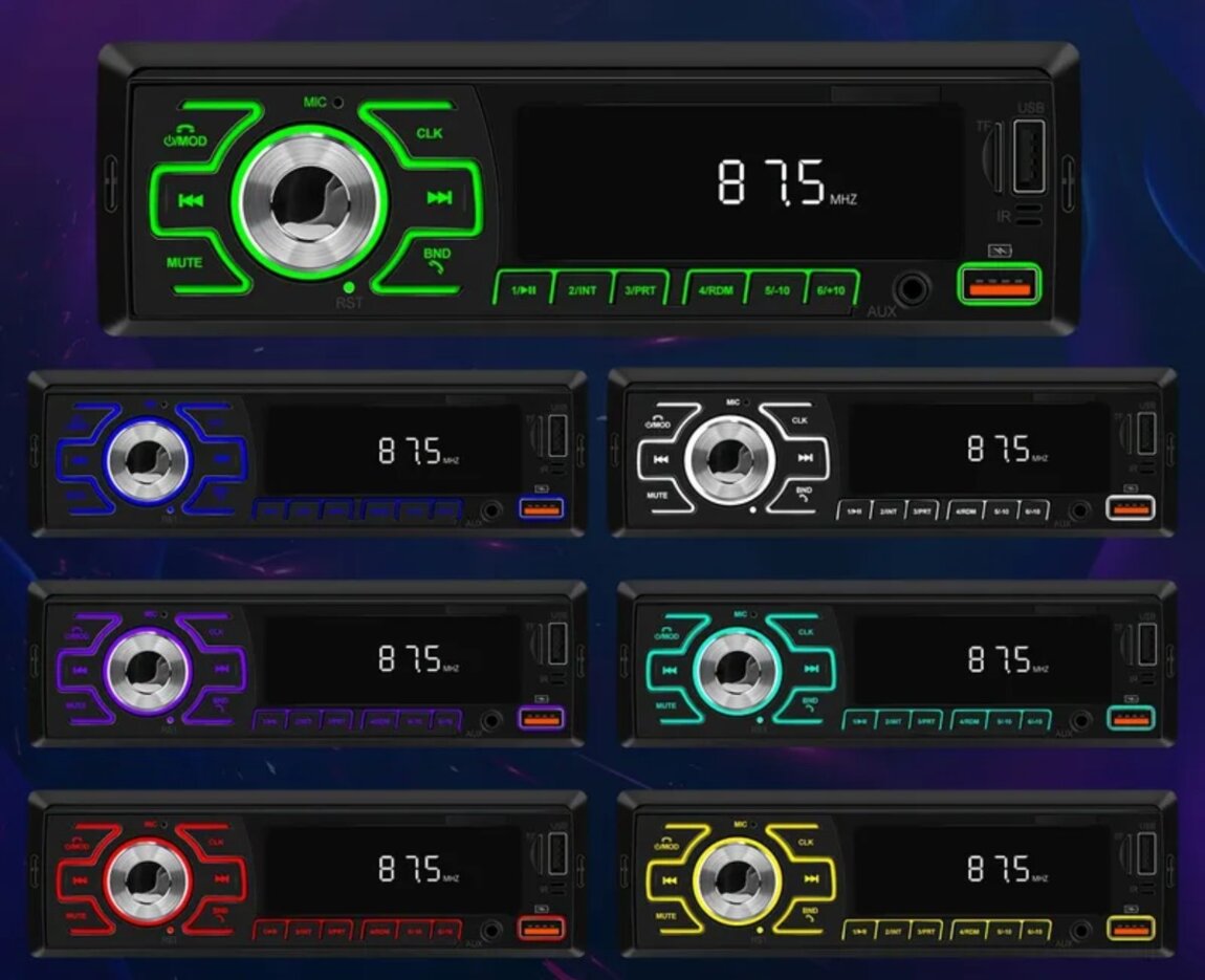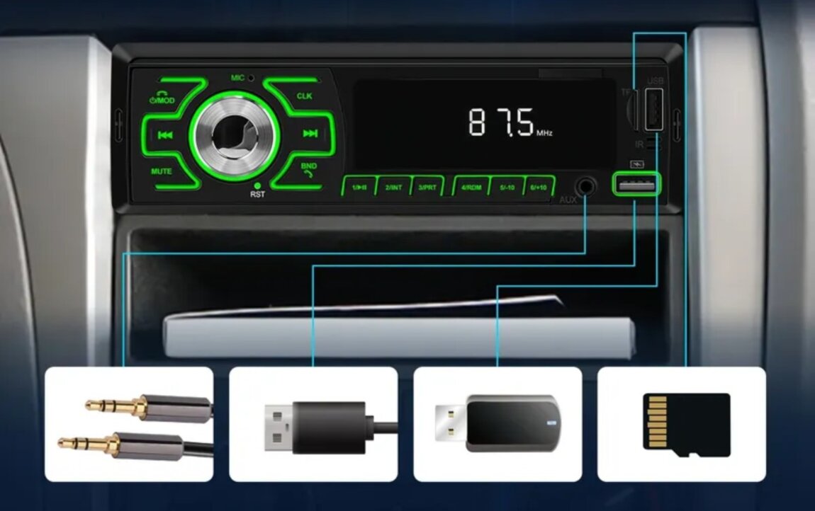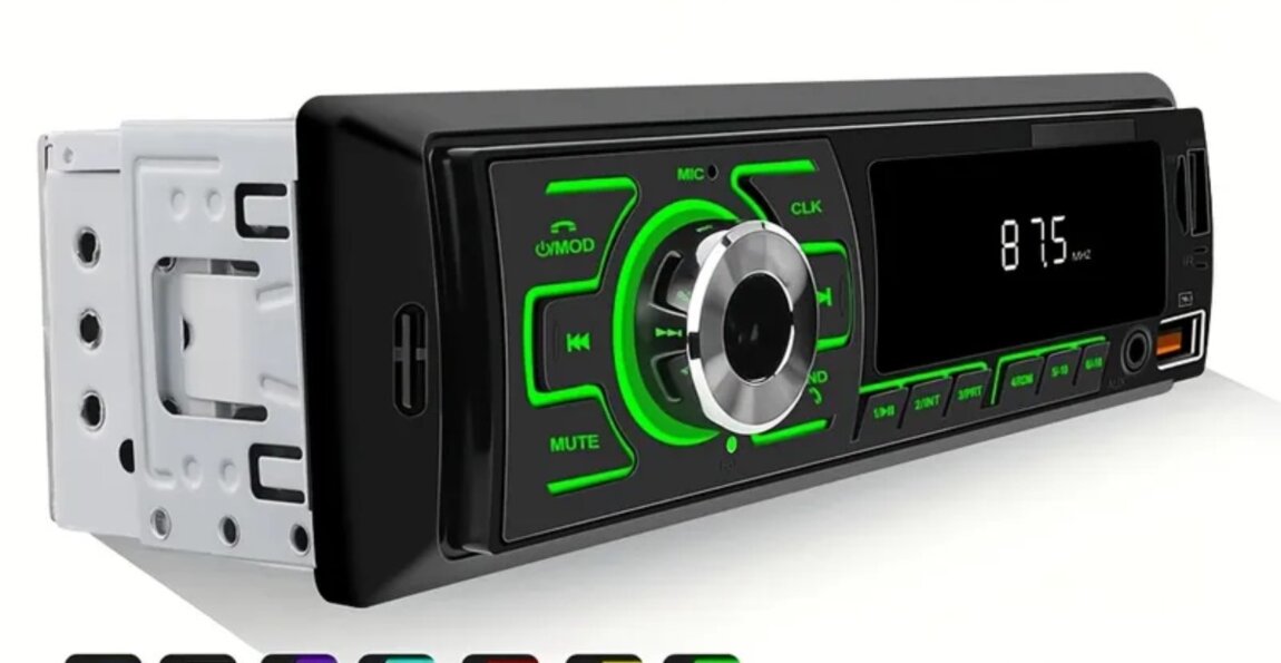 Воспроизведение с TF, USB, блютуз, AUX. Эквалайзер, память на радиостанции, цифровое табло. Возможность выбрать подсветку, принимать звонки. В комплекте фишки для подключения.