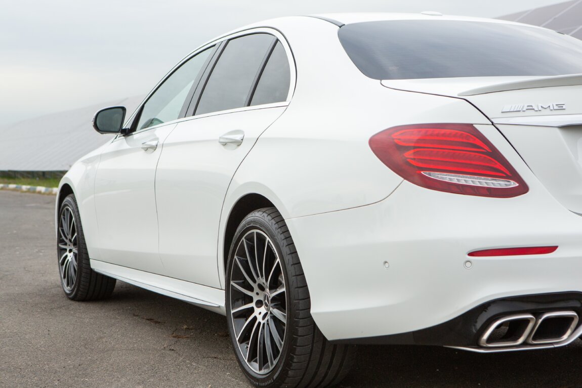 Chiria automobilului de lux Mercedes-Benz E Class w213 AMG E63 de culoare albă la prețul de 125 €/zi (23 €/ora).