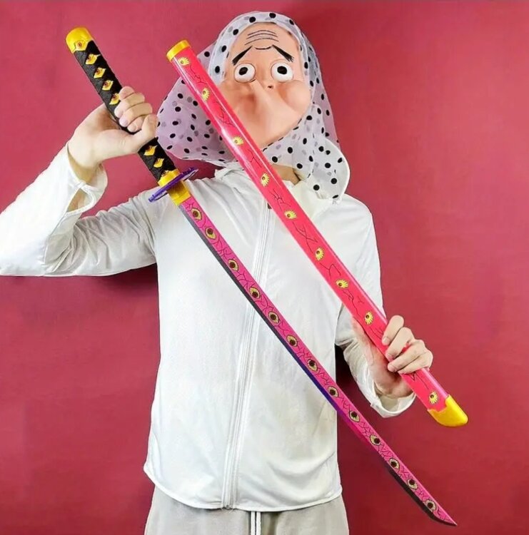 Катана из аниме «Клинок, рассекающий демонов» (Kimetsu no Yaiba / Demon Slayer), оружие Кокушибо, верхней луны Первой. Узнаваемый меч с уникальным дизайном клинка, украшенного глазами, и характерной рукоятью — эффектный атрибут для косплея и коллекции фанатов аниме.